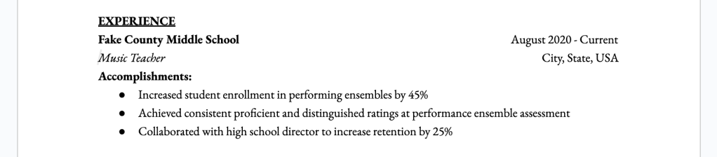 List any and all extra certifications that are related to your job. I will be finished with Orff-Schulwerk Level III and will replace “Orff-Schulwerk Level II” with “Certified Orff-Schulwerk Instructor.” If you have the Google Level 1 training also list that. I personally wouldn’t list all the health and safety training that your school makes you do because that’s pretty standard stuff. But be sure to list anything that is music specific or isn’t a standard thing that almost every educator get certifications for.